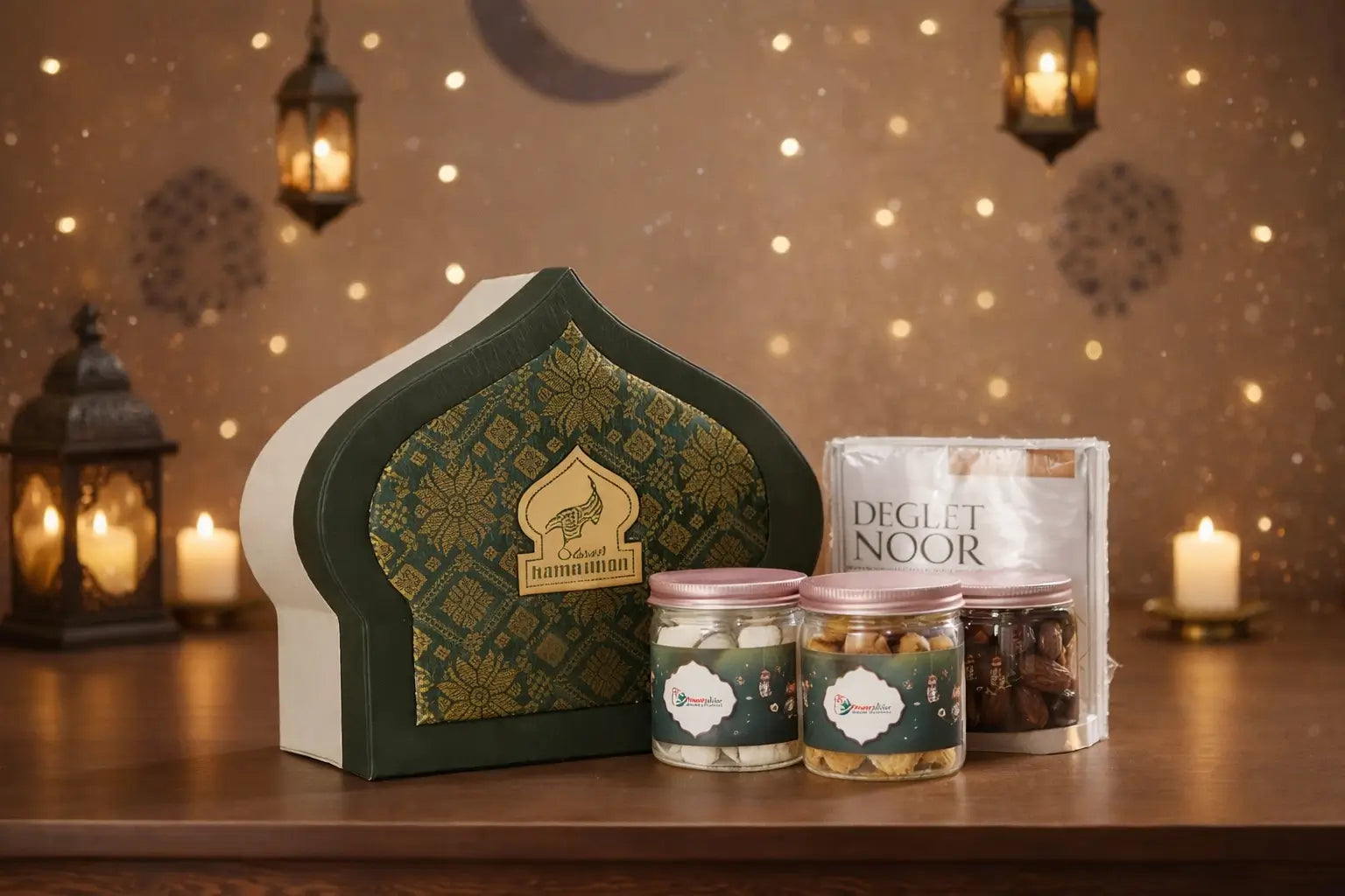 - Halal Gourmet Hamper — premium dates, nuts, and cookies in elegant packaging.